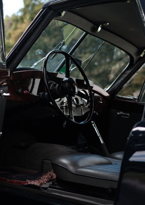 Wire wheels and dual exhausts were options. The Drop head Coupé (DHC) had a bulkier lined canvas top that lowered onto the body behind the seats, a fixed windscreen integral with the body, wind-up side windows, and a small rear seat. It also had a walnut-veneered dashboard and door cappings. The Fixed Head Coupé (FHC) shared the DHCs interior trim and rear seat. The car which is for sale here is a Left hand drive Drop Head Coupe. One of only 2310 cars that were ever produced, according to Jaguar Heritage trust.