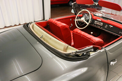 A restored 1960 Mercedes-Benz 190 SL, finished in gray with red leather and a black soft-top.